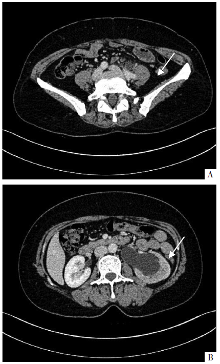妇科检查示:外阴发育正常,已婚已产型,阴道畅,黏膜光滑,盆腔空虚,触诊阴道残端略增厚,未触及明显结节,下腹部压痛阳性。经阴道彩色超声示:阴道顶上方、盆腔中央可见大小约2.4 cm×2.2 cm囊实性占位,边界清,回声不均,内可见血流信号,与肠道关系密切,血管阻力指数0.49;右侧卵巢大小2.9 cm×1.8 cm,左侧卵巢未探及异常。全腹增强CT示:①子宫切除术后,术区未见明显异常;②左侧髂血管旁不规则软组织(见图1A),增强可见钙化,考虑转移灶,左侧肾盂和输尿管中、上段扩张积水(见图1B);③直肠下壁段增厚。电子结肠镜见:直肠黏膜散在点状糜烂面,提示直肠炎。人乳头瘤病毒检测为阴性。液基薄层细胞学检查示:无上皮内病变及恶性病变(negative for intraepithelial lesion or malignancy,NILM)。肿瘤标志物检查示:糖类抗原125(carbohydrate antigen 125,CA125)46.7 U/mL,人附睾蛋白4(human epididymis protein 4,HE4)206 pmol/L。