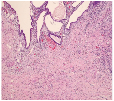 该病多表现为明显的阴道出血、下腹痛,既往多合并深部浸润型EMs,妇科检查时可触及痛性结节或包块,或存在肉眼可见紫蓝色结节,妇科超声可表现为异位病灶周围组织结构欠清晰,回声不均匀,较大的异位病灶可见混合低回声,但诊断的金标准仍然是病理检查。